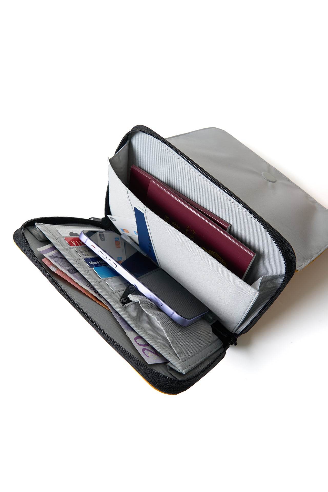 Slots, zip pockets, and pen loop for IDs, tickets, coins, and boarding passes.